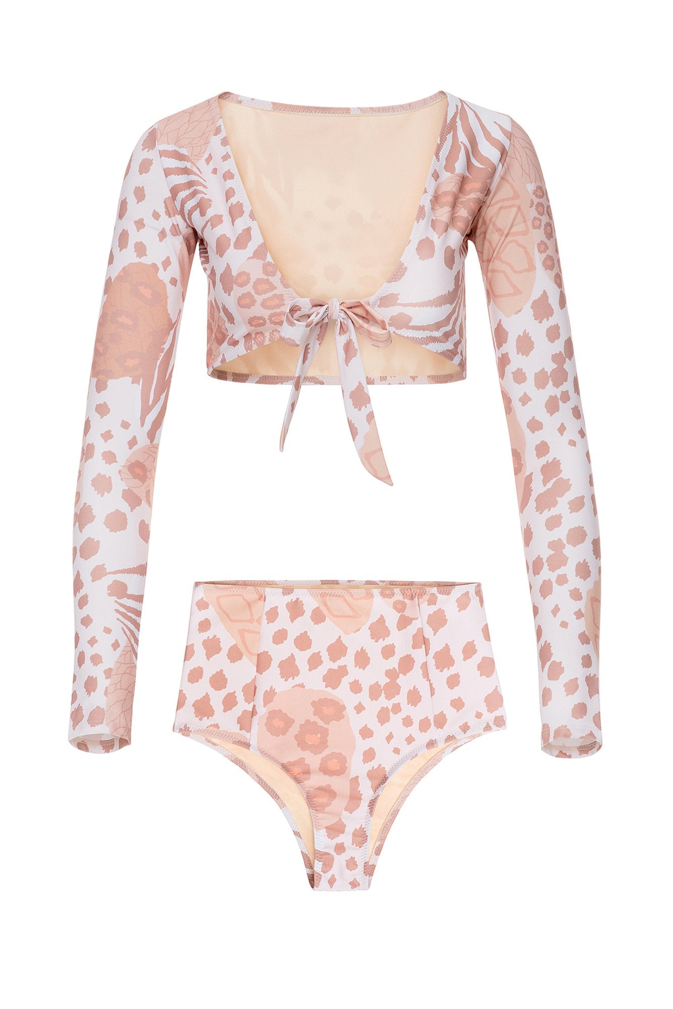 Long sleeve bikini top featuring a front tie design and a leopard print