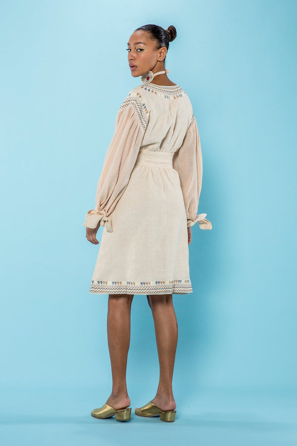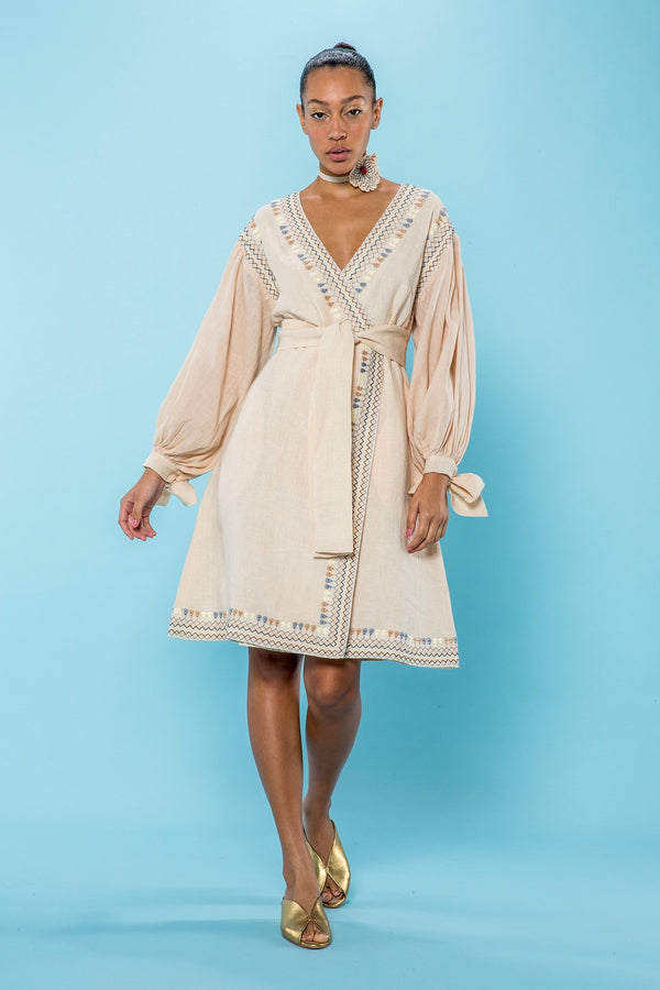 Description Embroidered wrap linen dress featuring deep v-neckline, full balloon sleeves with self-tie cuff, tie-waist wrap closure. Straight hem. Sizing Model is 5'9" | 32.5" bust | 23.5" waist | 36" hips Model wears size small Composition + Care Composition:...