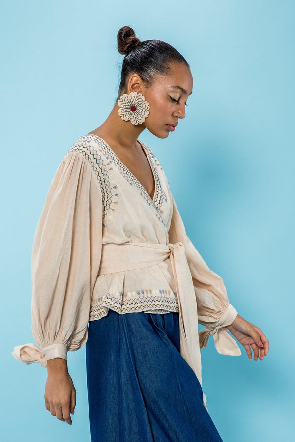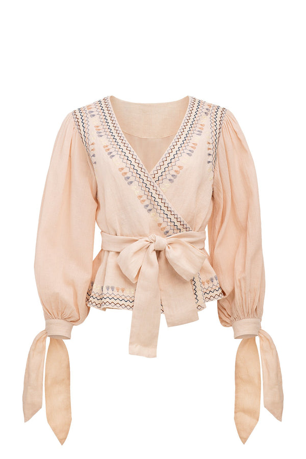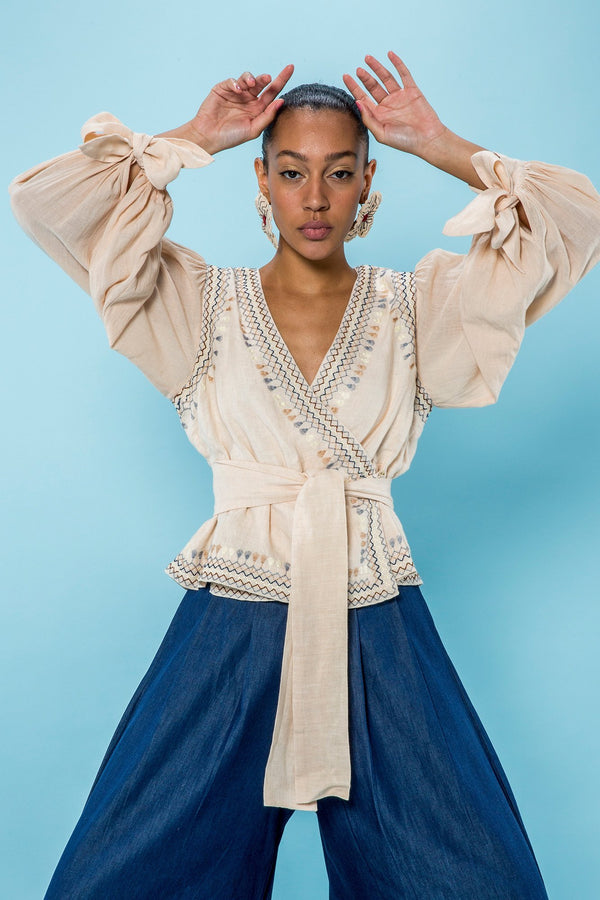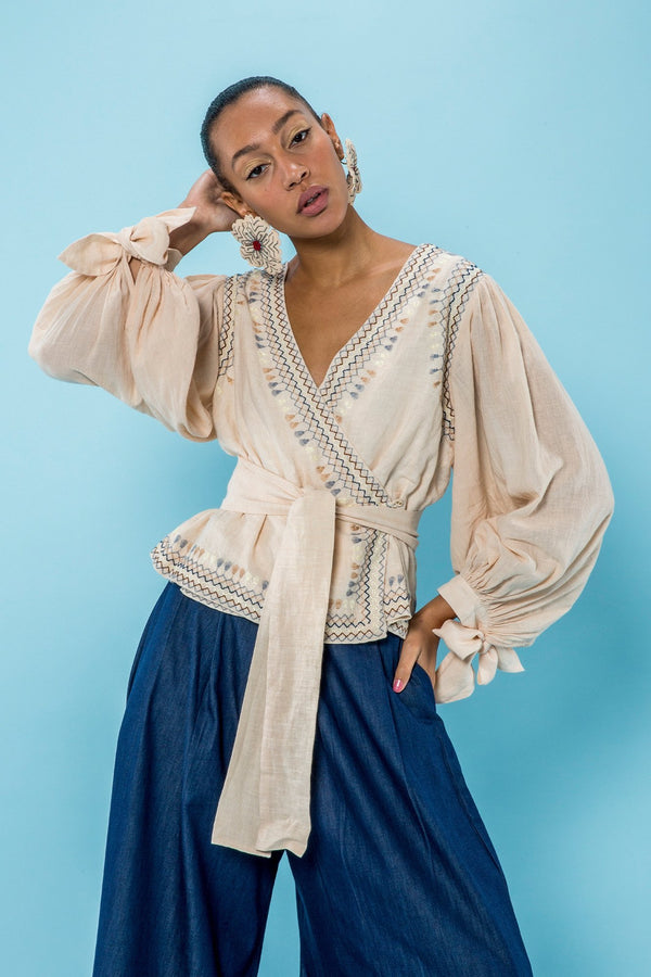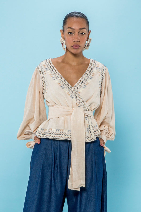 Description Embroidered wrap linen blouse featuring deep v-neckline, full balloon sleeves with self-tie cuff, tie-waist wrap closure. Straight hem. Sizing Model is 5'9" | 32.5" bust | 23.5" waist | 36" hips Model wears size small Composition + Care Composition:...