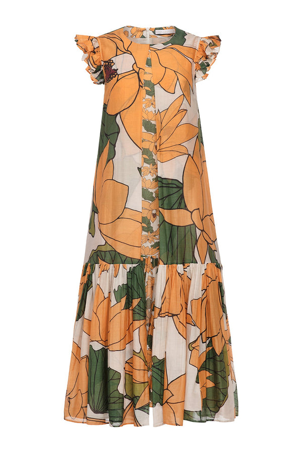 Description Midi length style dress printed in our Lotus Garden cotton silk featuring a crew neckline, contrasting inverted pleat, flutter sleeves, and full skirt. Unlined. Sizing Model is 5'9" | 32.5" bust | 23.5" waist | 36" hips Model wears size...