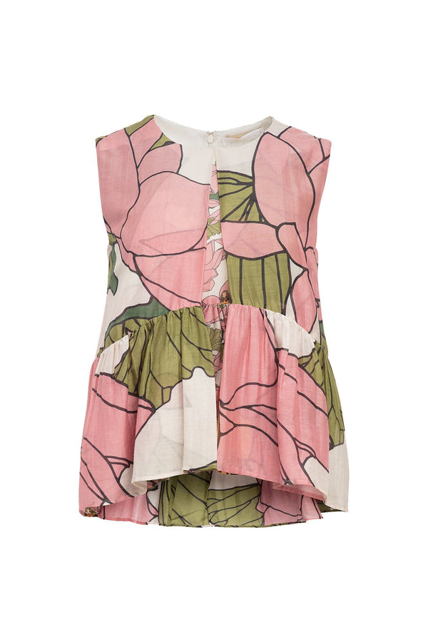 Description Sleeveless top printed in our Lotus Flower cotton silk, featuring a crew neckline, contrasting inverted pleat, flowing silhouette, and ruffled hem. Sizing Model is 5'9" | 32.5" bust | 23.5" waist | 36" hips Model wears size small Composition...