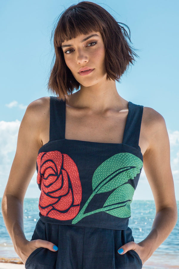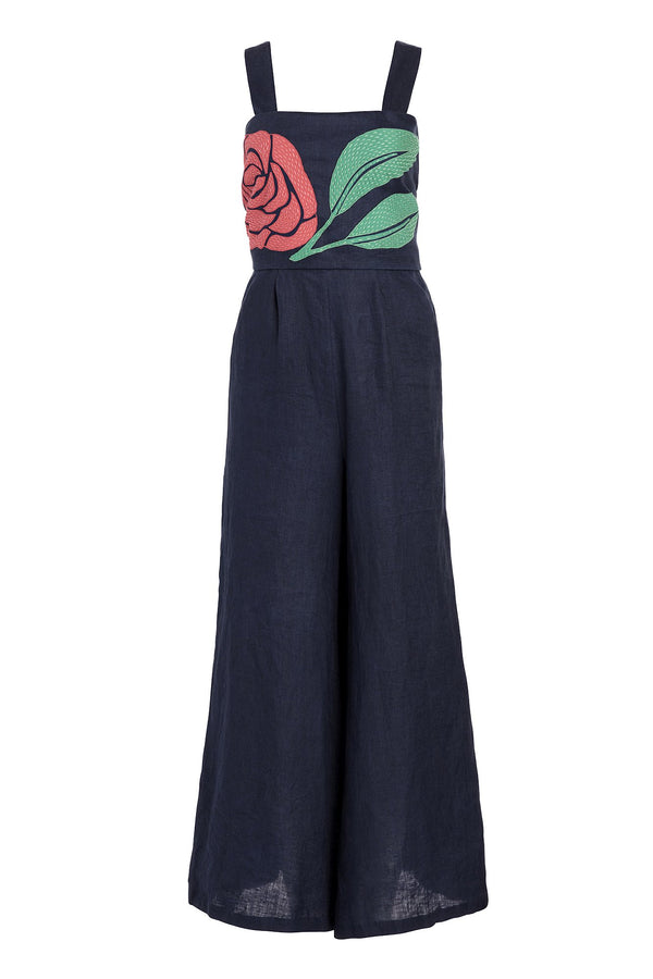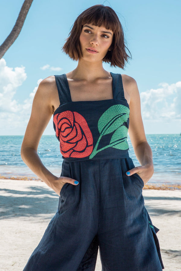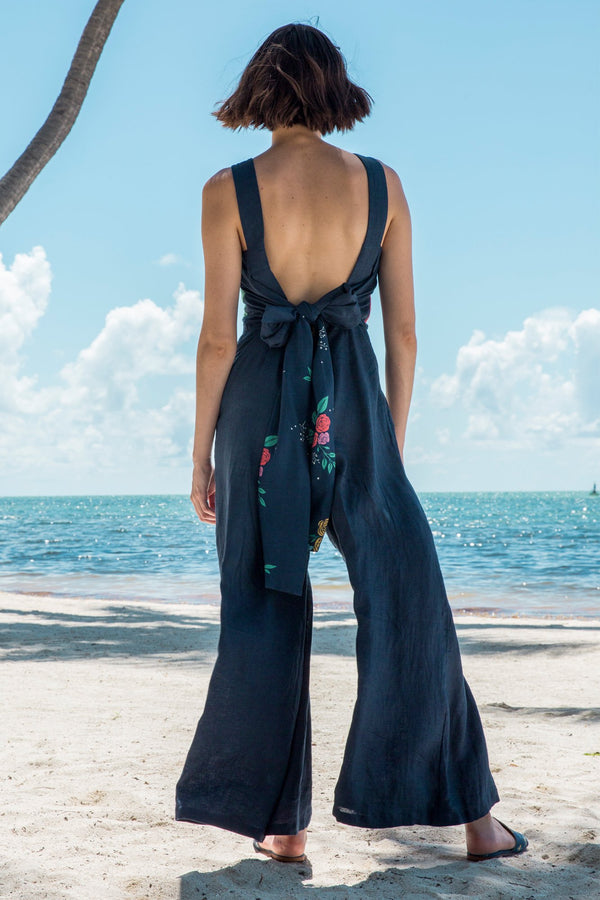 Description Jumpsuit featuring a wide leg silhouette with a tie back bow and embroidered bodice. Details Unlined Composition: 100% linen Country of origin: India Sizing Model is 5'6" | 30" bust | 23.5" waist | 34" hips Model wears size...