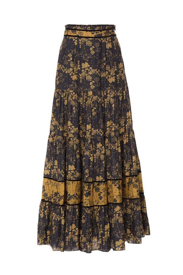 Description Maxi skirt featuring a rose print and a tiered skirt. Pair with our Gio Blouse.  Details Side zipper Lined Composition: 90% Cotton 10% Silk Country of origin: India Care Dry Clean