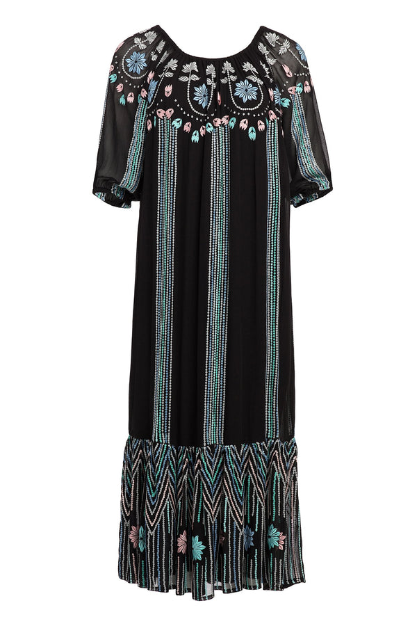 Description Off the shoulder maxi dress featuring embroidery and sequins throughout. Details Lined Composition: 100% viscose crepe Country of origin: India Sizing Model is 5'6" | 30" bust | 23.5" waist | 34" hips Model wears size small Care Dry...