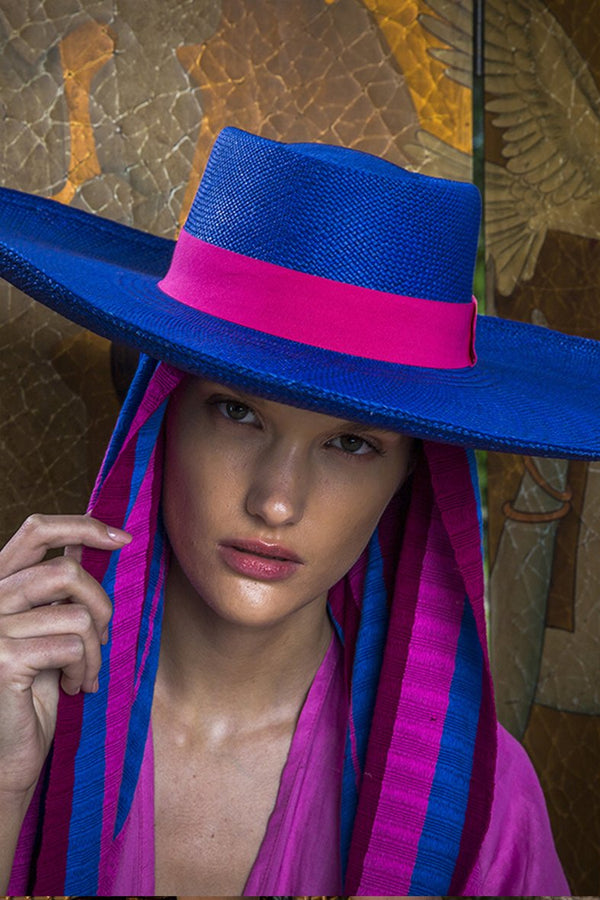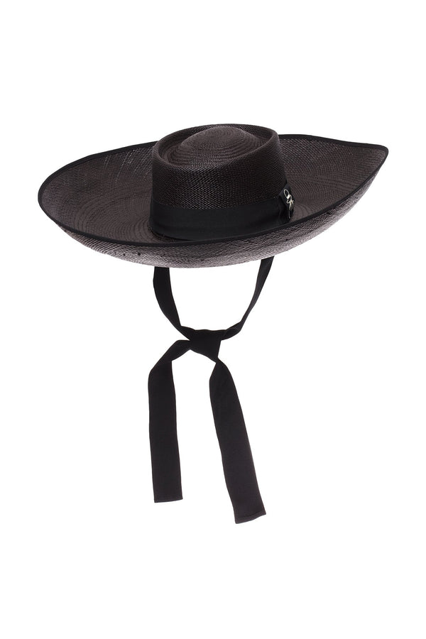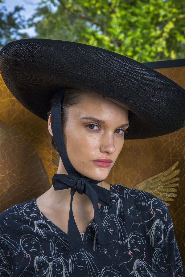 Description Oversized hat featuring neck ties Details Composition: 100% straw Country of origin: Ecuador Care Dry clean Pictured in Natural / Black, Black, and Blue / Pink