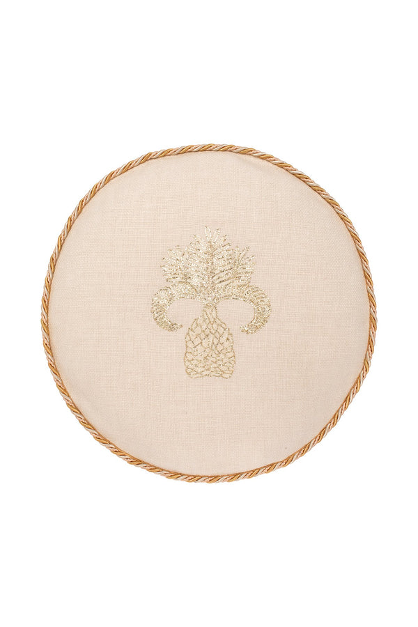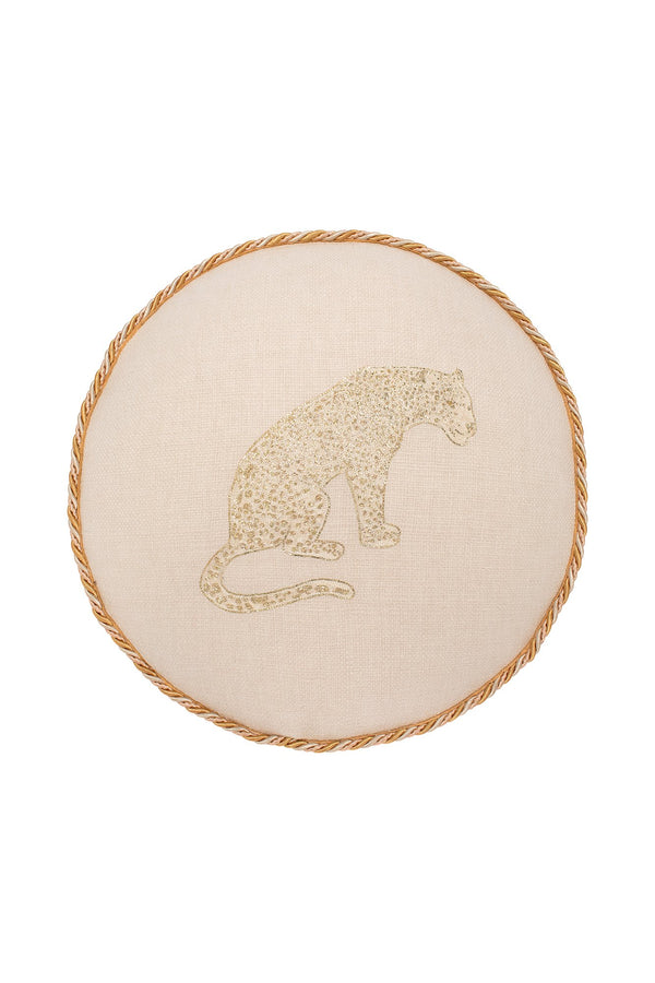 Pre Order | Estimated ship date of June 15th 2020 Description Round pillow featuring our Desert Animals design with gold embroidery and upholstered gold edging. Hand embroidered gold thread pillow Material: 100% upholstered cotton with edges made of gold upholstered rope...