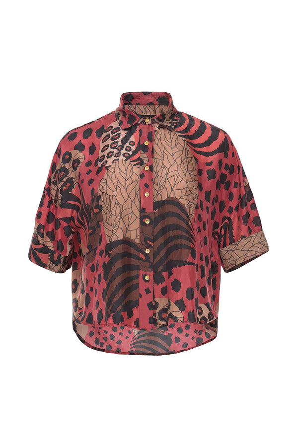 Cropped satin blouse featuring a leopard print. Classic structured collar and button up closure.