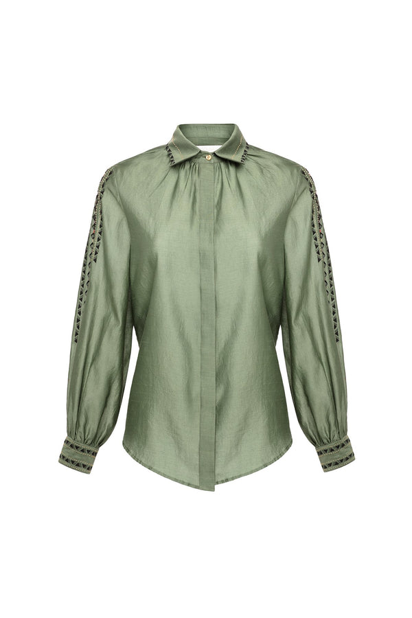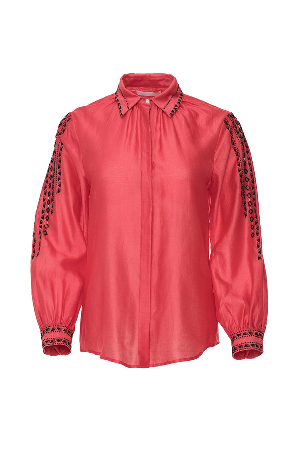 Description Long sleeve button-down top featuring embroidery throughout. Pair with our Ferry Pant. Details Button fastening through front Composition: 84% Cotton 16% Silk Country of origin: India Care Dry clean Pictured in Red