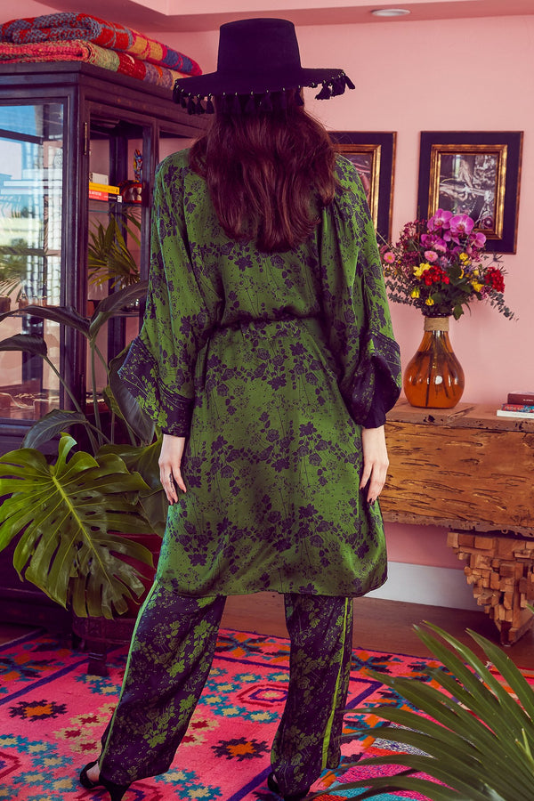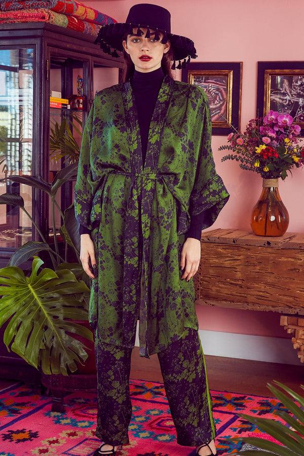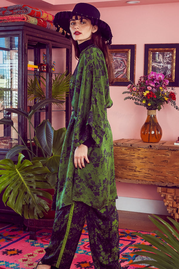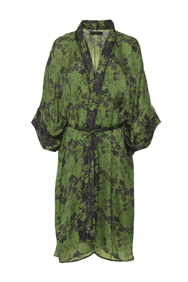Description Floral kimono featuring wide three quarter sleeves and an oversized bodice. Details Self-tie Composition: 50% Silk 50% Viscose Satin Country of origin: India Care Dry clean Pictured in Green Roses