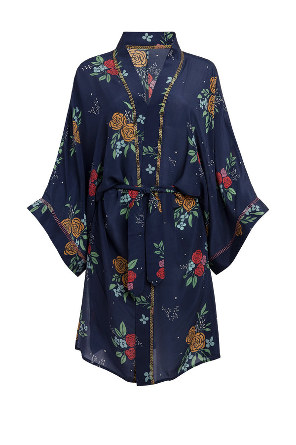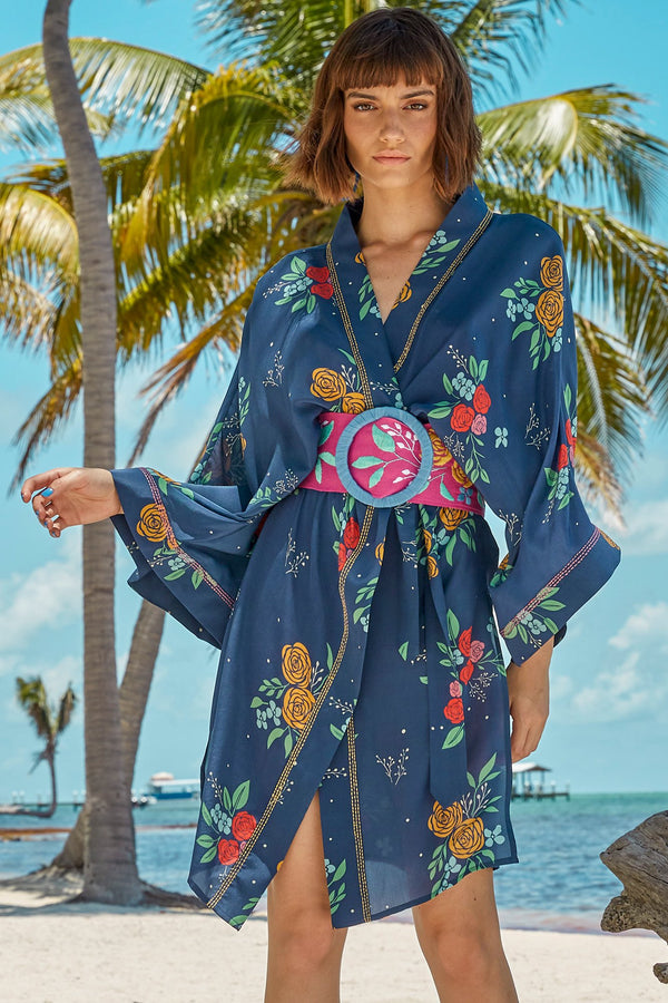 Description Floral kimono featuring wide three quarter sleeves and an oversized bodice. Details Self-tie Unlined Composition: 100% silk Country of origin: India Sizing Model is 5'6" | 30" bust | 23.5" waist | 34" hips Model wears size small Care...