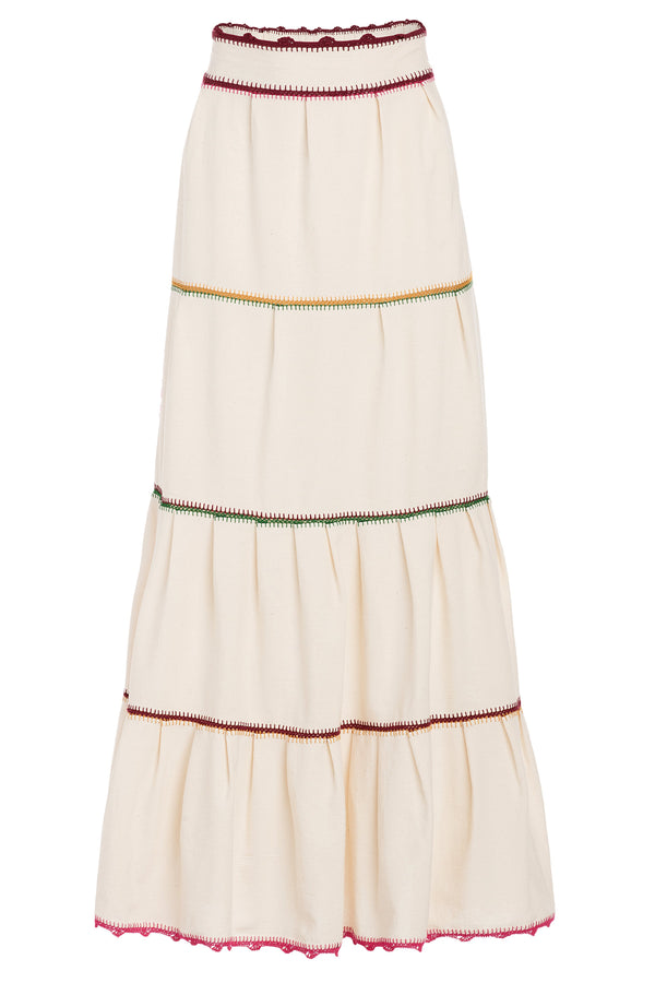 Description Tiered maxi skirt in natural with contrasting topstitching, an elasticized waist, and a tiered hem. Handmade by artisans in Mexico. This piece is sustainably produced without the use of electricity, pesticides or chemicals. Composition + Care Composition: 100% Cotton...