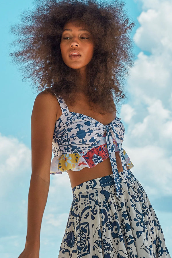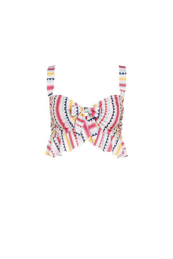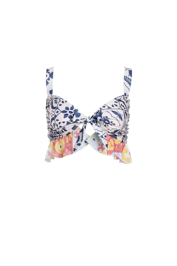 Description Bikini top featuring a front tie and ruffles. Made with ECOCEAN® - Recycled polyester from PET bottles, industrial polyester wastes and even clothing. The printing process is environmentally friendly, being a dry print (without the use of water) and...