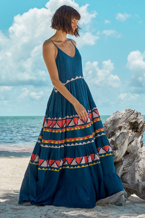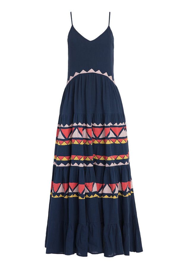 Description Spaghetti strap maxi dress featuring a tiered skirt and triangle appliqués. Details Adjustable spaghetti straps Open back Lined Composition: 100% cotton gauze Country of origin: India Sizing Model is 5'6" | 30" bust | 23.5" waist | 34" hips...