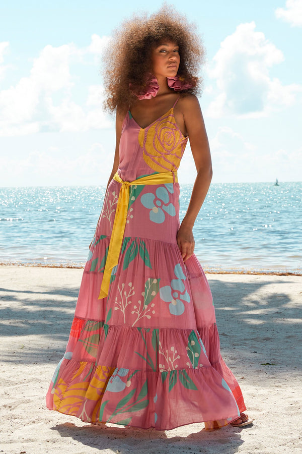 Description Floral maxi dress featuring a self-tie belt and tiered skirt. Details Adjustable spaghetti straps Open back Unlined Side zipper Composition: 95% cotton 5% viscose Country of origin: India Sizing Model is 5'9" | 32.5" bust | 23.5" waist |...