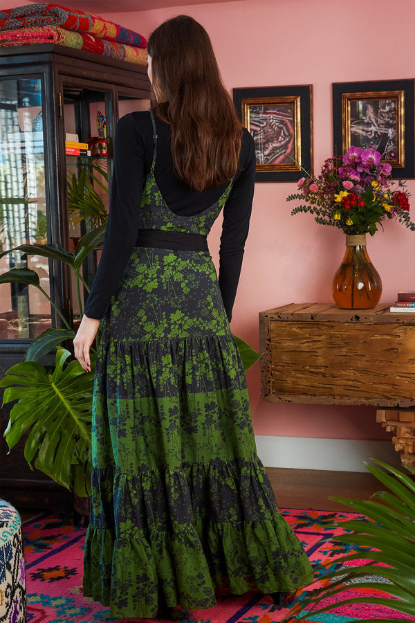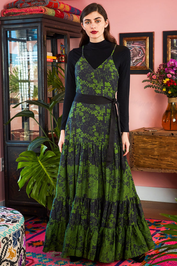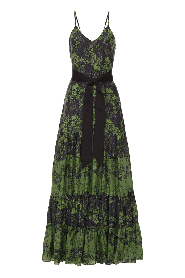 Floral maxi dress featuring a self-tie belt and tiered skirt.