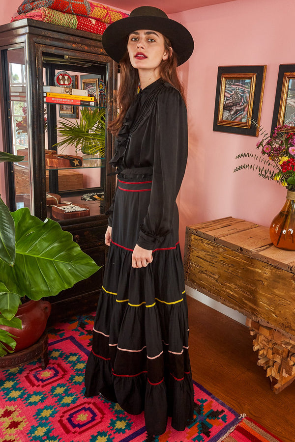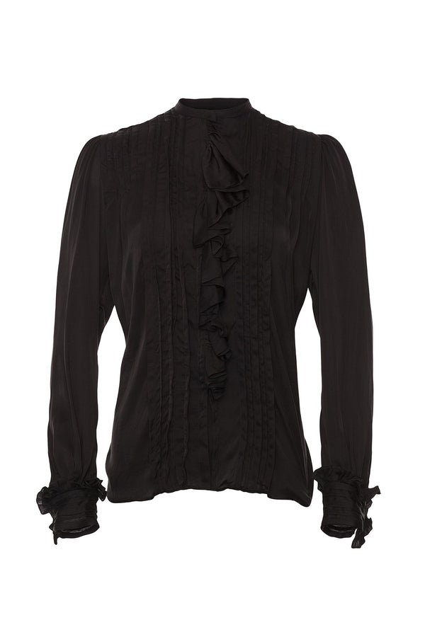 Description Long sleeve blouse featuring ruffles along the neckline and wrists Details Composition: 100% Silk Satin Country of origin: India Care Dry clean Pictured in Sacred Hearts