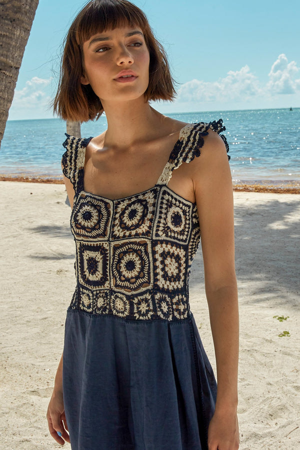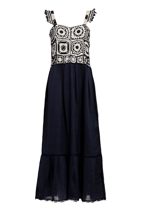 Description Maxi dress featuring a crochet bodice, ruffled straps and a tiered skirt. Handmade by artisans in Mexico. Details Open back Unlined Composition: 50% linen 50% cotton Country of Origin: Mexico Sizing Model is 5'6" | 30" bust | 23.5"...