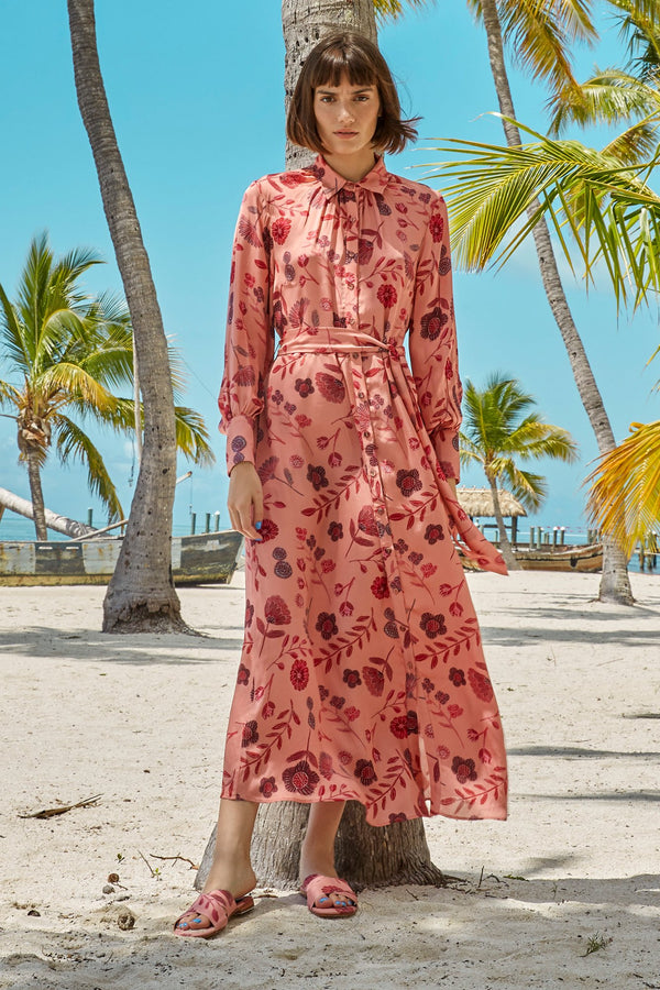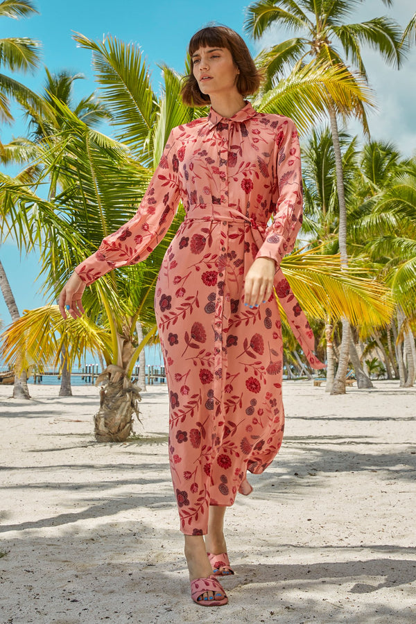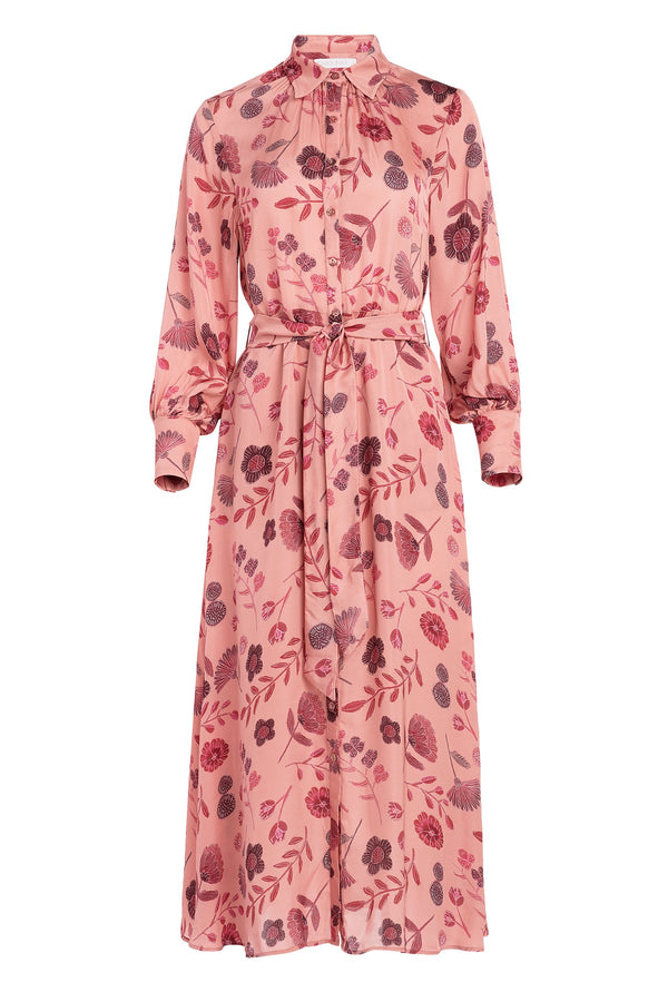 Description Long sleeve maxi dress featuring a floral print, flowing silhouette and button fastening through front. Details Self tie Unlined Buttons on wrist Composition: 100% satin viscose Country of origin: India Sizing Model is 5'6" | 30" bust | 23.5"...
