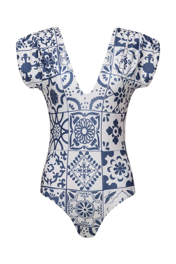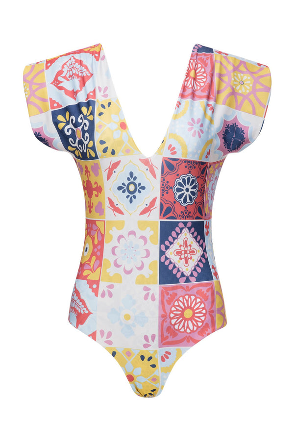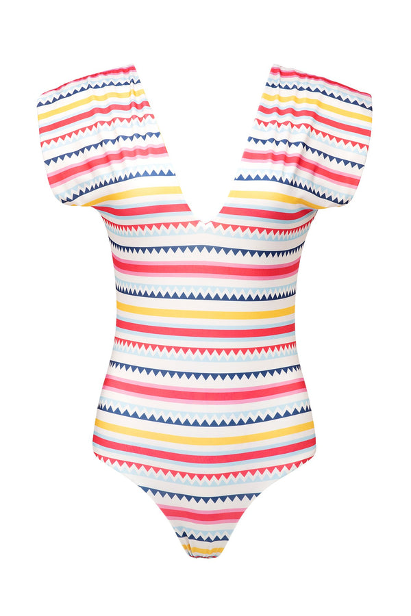 Description One piece swimsuit featuring ruched sleeves, v neckline, and low back. Made with ECOCEANĀ® - Recycled polyester from PET bottles, industrial polyester wastes and even clothing. The printing process is environmentally friendly, being a dry print (without the use...