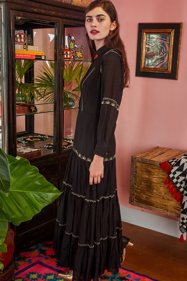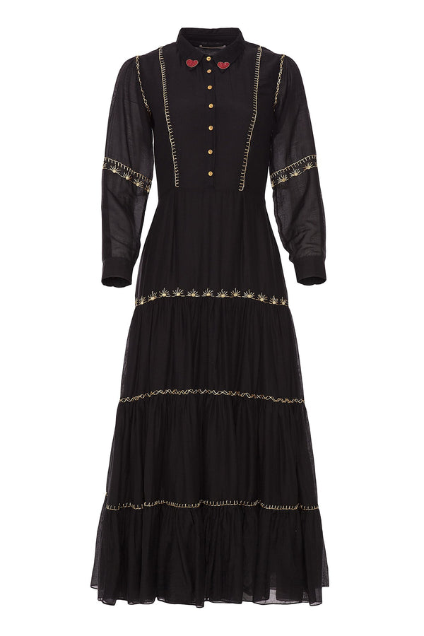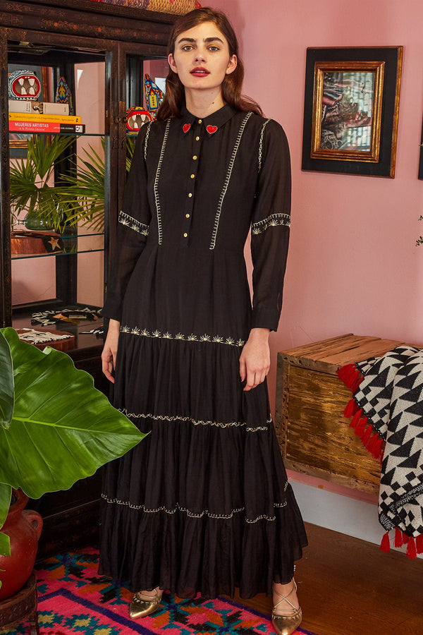 Description Long sleeve maxi dress featuring a shirt bodice, contrast stitching and tiered skirt. Details Composition: 100% cotton Country of origin: India Care Dry clean Pictured in Sacred Hearts