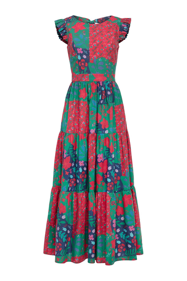 Description Sleeveless style maxi dress printed in our Country Blossom cotton poplin. Features flutter sleeves, open-back with self-tie bow, fixed waist, removable belt, and tiered ruffled detailing. Sizing Model is 5'9" | 32.5" bust | 23.5" waist | 36" hips...