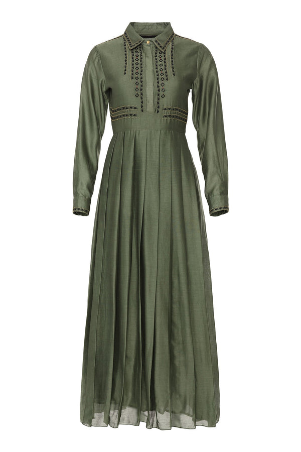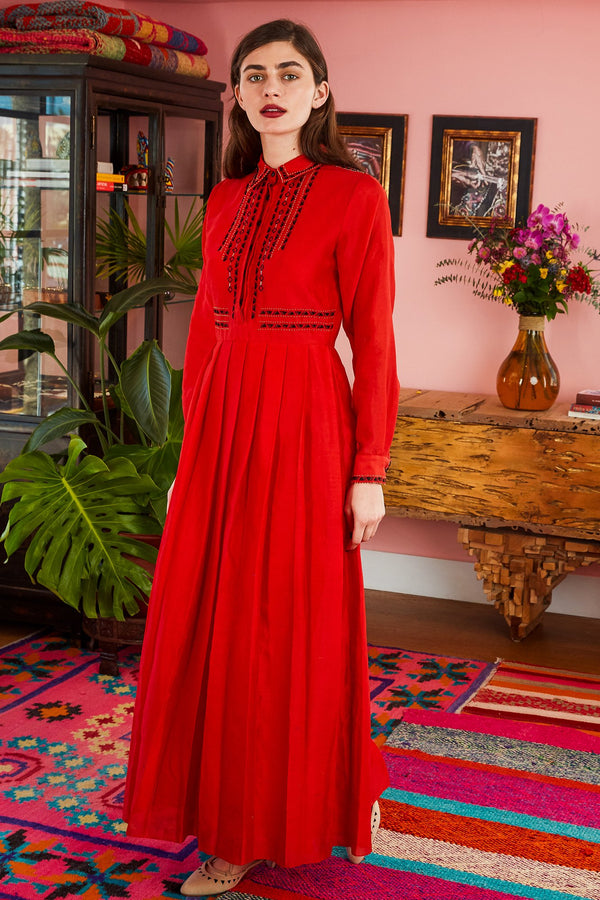 Description Long sleeve maxi dress featuring a flowing silhouette and pleated skirt Details Composition: 84% Cotton 16% Silk Country of origin: India Care Dry clean Pictured in Basil and Red