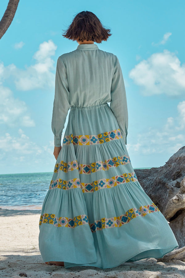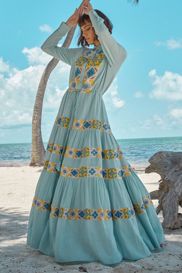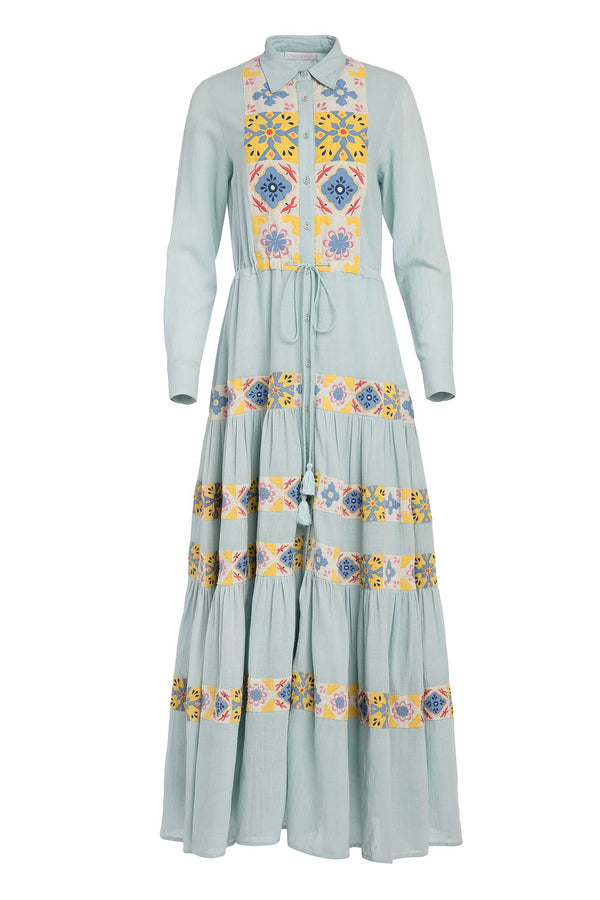 Description Long sleeve maxi dress featuring an embroidered patchwork design, tiered skirt, and a flowing silhouette Details Classic button-down blouse bodice Adjustable front tie waist Lined Composition: 100% cotton gauze Country of origin: India Sizing Model is 5'6" | 30"...