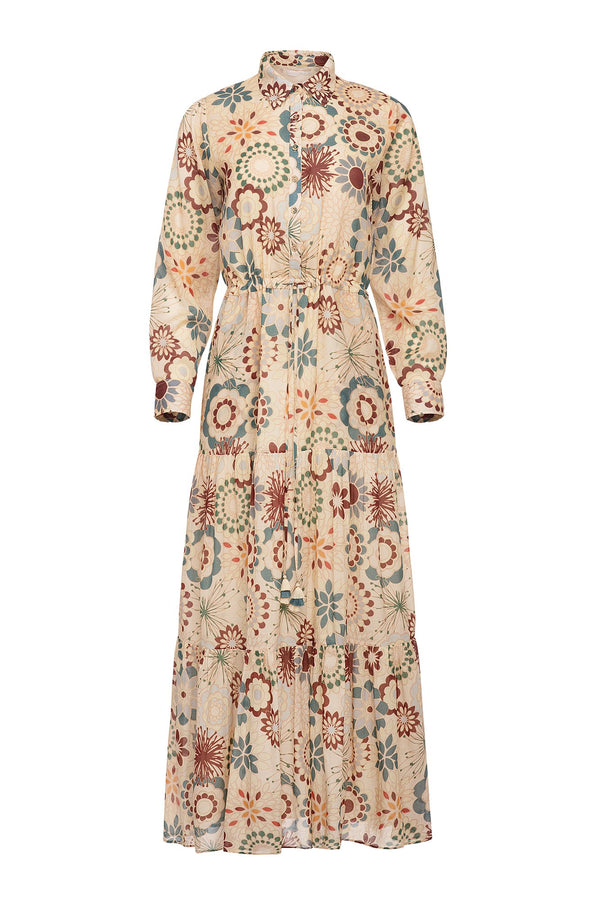Description A Carolina K staple. Long sleeve maxi dress printed in our Flower Power cotton featuring a flowing silhouette, spread collar, partial button closure, drawcord waist, and tiered skirt. Lined. Sizing Model is 5'9" | 32.5" bust | 23.5" waist...