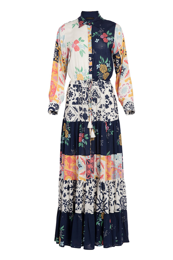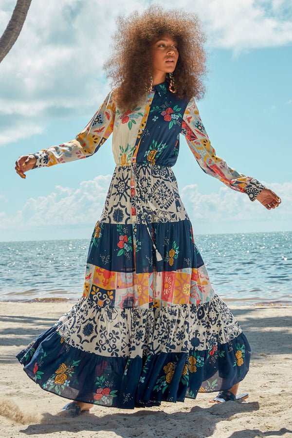 Description Long sleeve maxi dress featuring a patchwork print, tiered skirt, and a flowing silhouette Details Unlined Classic button-down blouse bodice Buttons along the front Adjustable front tie waist Composition: 95% cotton 5% viscose Country of origin: India Sizing Model...