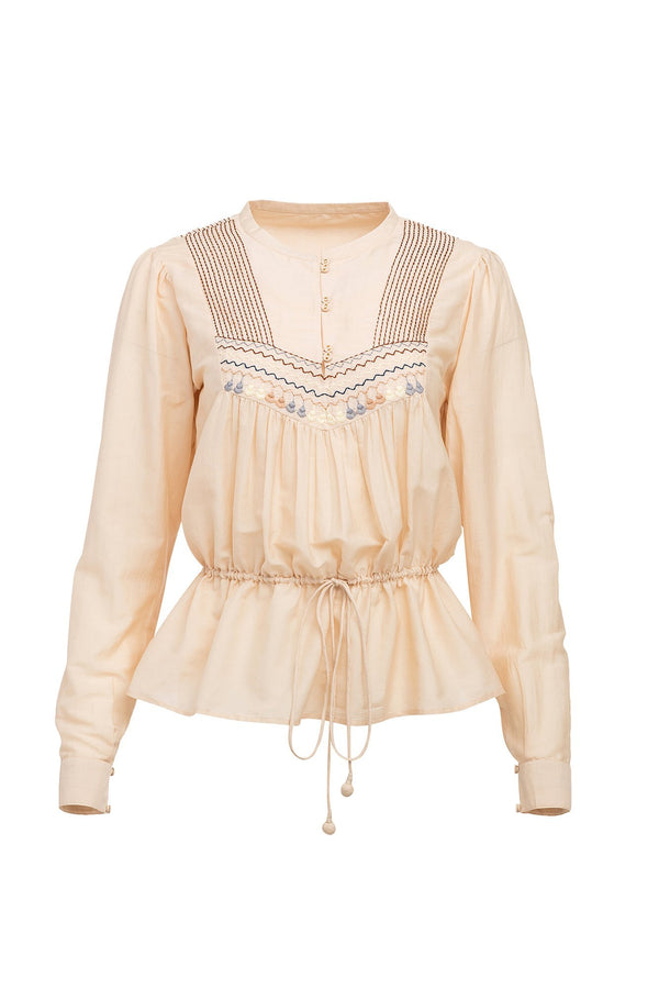 Description Long sleeve collarless top featuring embroidery detail at chest and back, partial button closure, drawcord waist, and straight hem. Sizing Model is 5'9" | 32.5" bust | 23.5" waist | 36" hips Model wears size small Composition + Care...