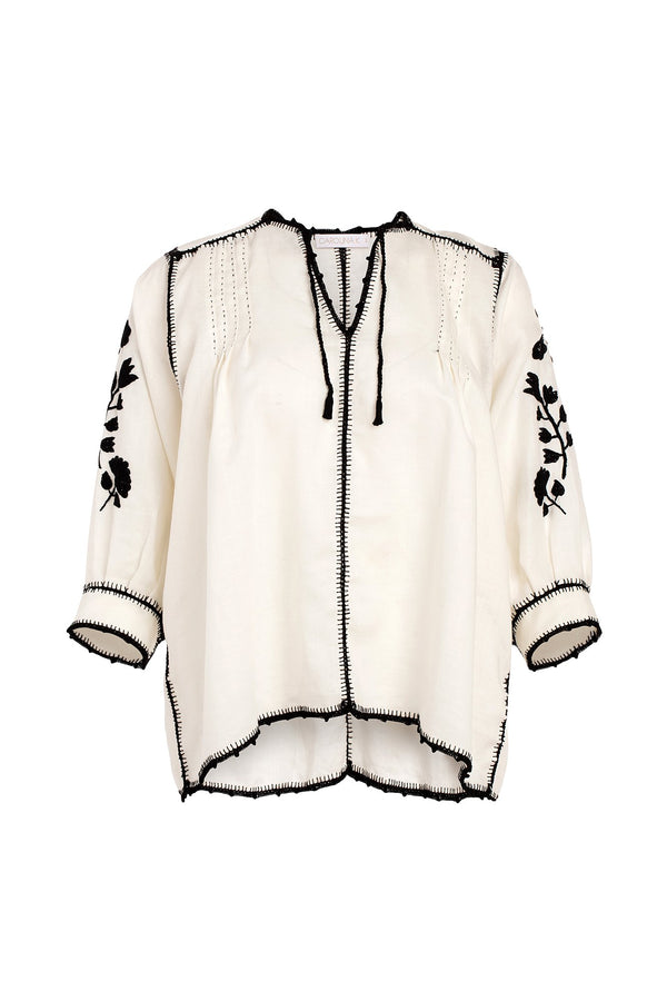 Description Cotton top featuring hand embroidered detailing on the sleeves and contrast stitching throughout. Hand made in Mexico by artisans. Details Three quarter sleeve Unlined Composition: 100% cotton Country of origin: Mexico Sizing Model is 5'9" | 32.5" bust |...