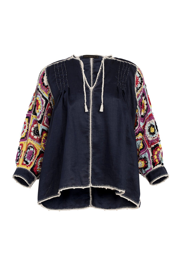 Cotton top featuring crochet patchwork sleeves and contrast stitching throughout.
