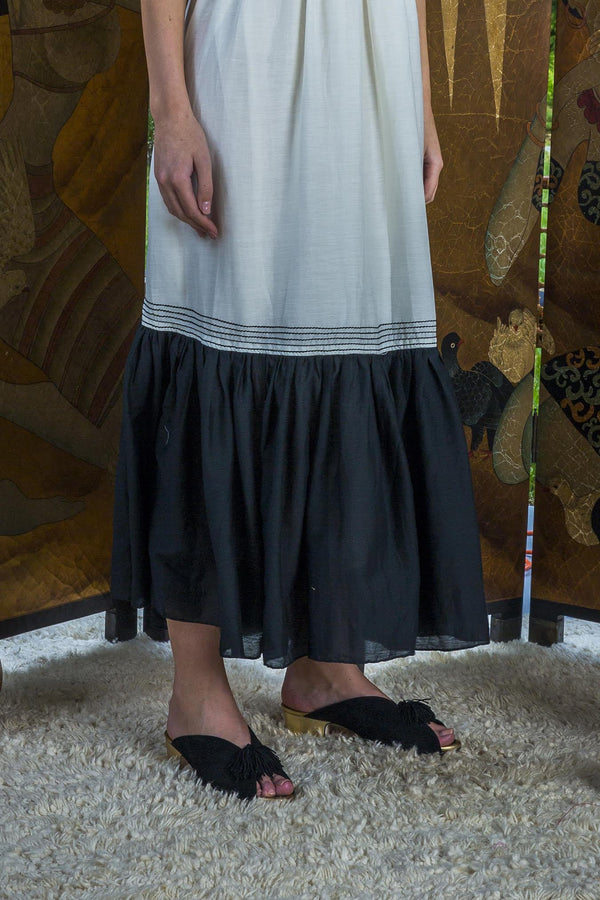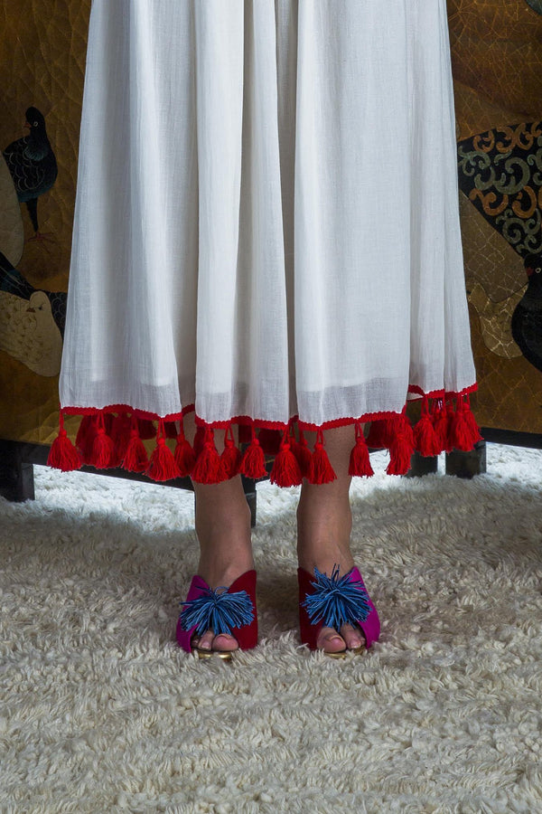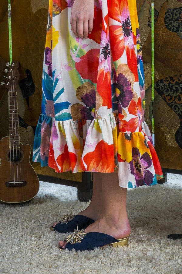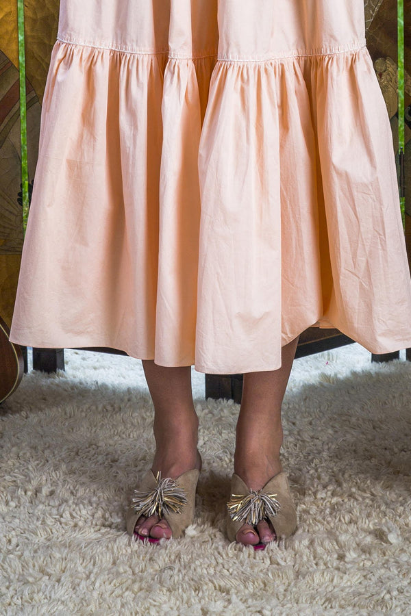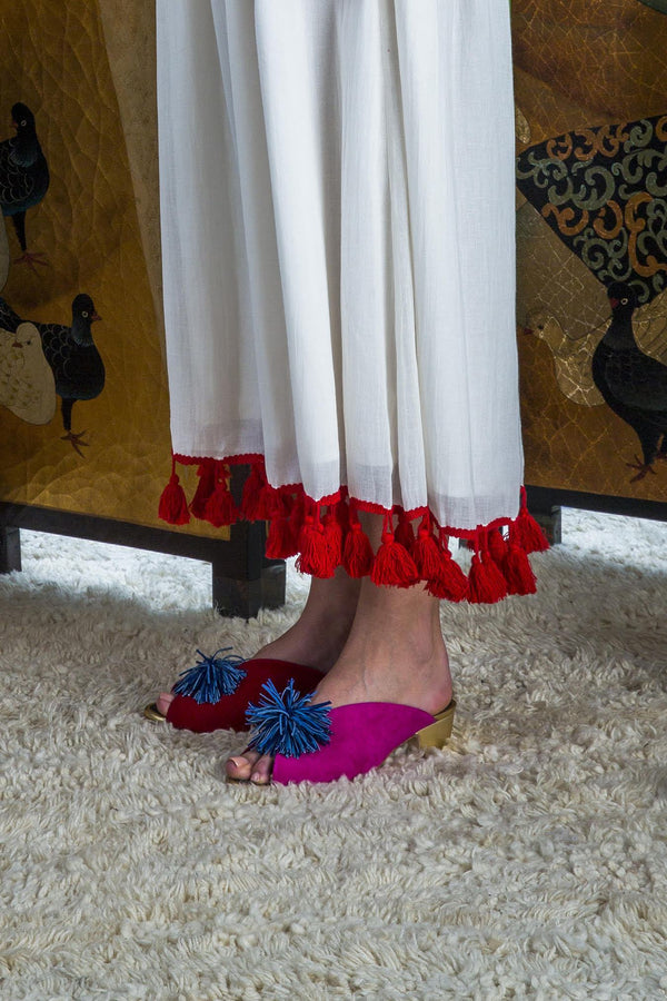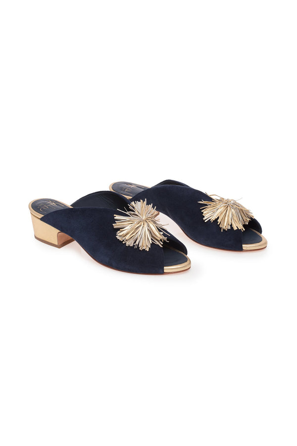 Leather suede slip-on mule featuring a pom pom detail and gold square heel.
