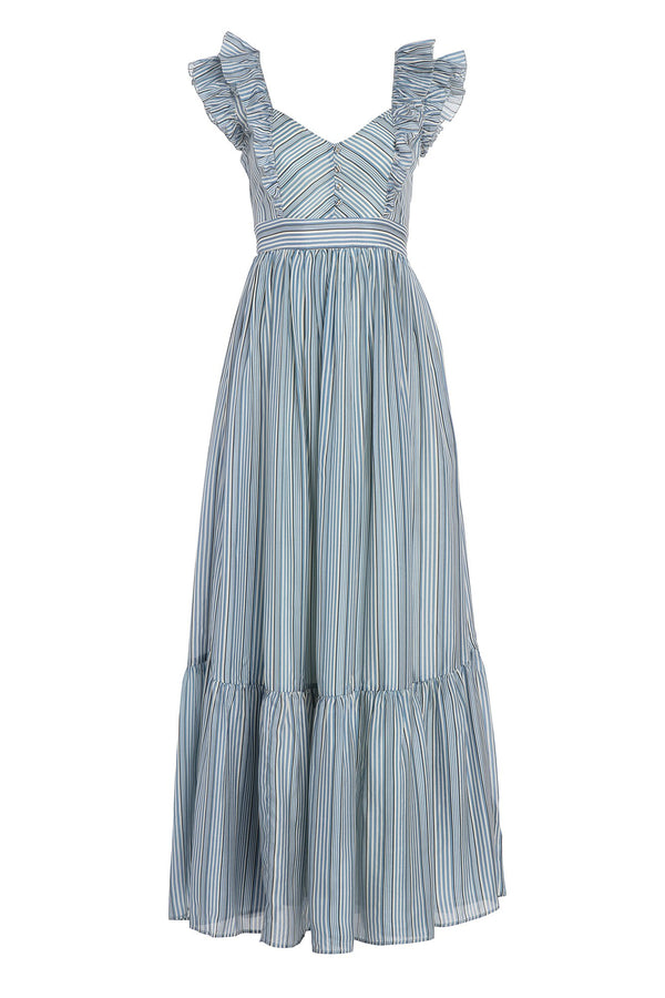 Description Maxi dress featuring a sweetheart neckline with ruffled shoulders and a tiered skirt. Details Lined Side zipper Composition: 100% silk Country of origin: India Sizing Model is 5'9" | 32.5" bust | 23.5" waist | 36" hips Model wears...