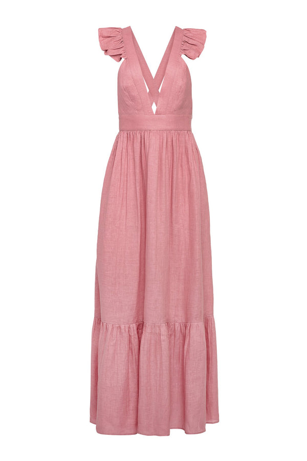 Description Linen midi dress featuring a deep v-neckline, flutter sleeves, criss-cross open back, ruffled hem, and zipper closure. Unlined. Sizing Model is 5'9" | 32.5" bust | 23.5" waist | 36" hips Model wears size small Composition + Care Composition:...