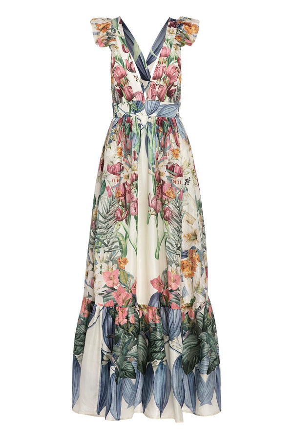 Description Maxi dress featuring a plunging neckline, ruffled sleeves and a flowing silhouette. Details Slip on Side zipper Lined Composition: 100% silk Country of origin: India Sizing Model is 5'9" | 32.5" bust | 23.5" waist | 36" hips Model...