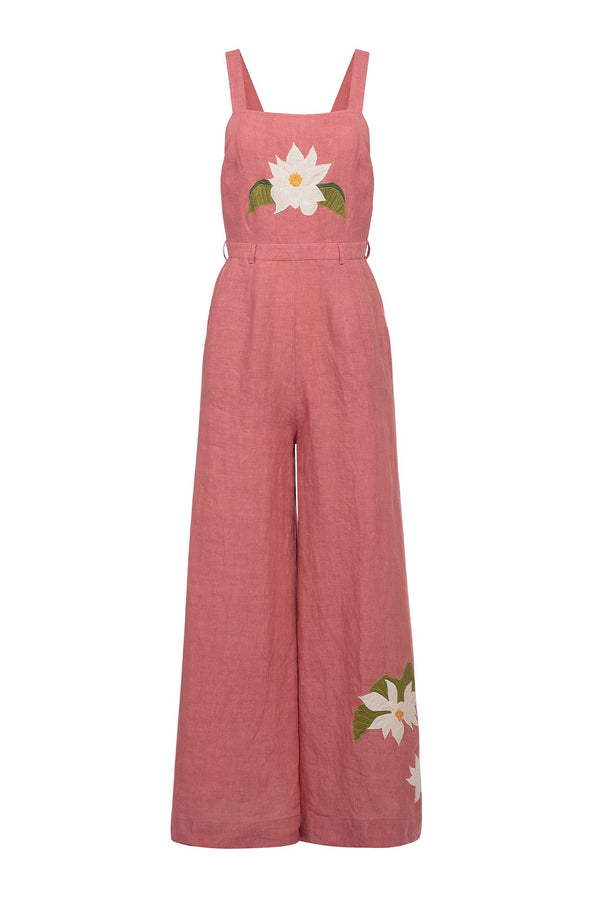 Description Bib-front linen jumpsuit featuring a square neckline, adjustable cross-back straps with tonal button fastening, and floral embroidery detail at chest and hem. Invisible back zip closure. Darted bust. Gathered waist. On-seam side pockets. Wide cropped leg. Unlined. Sizing Model...
