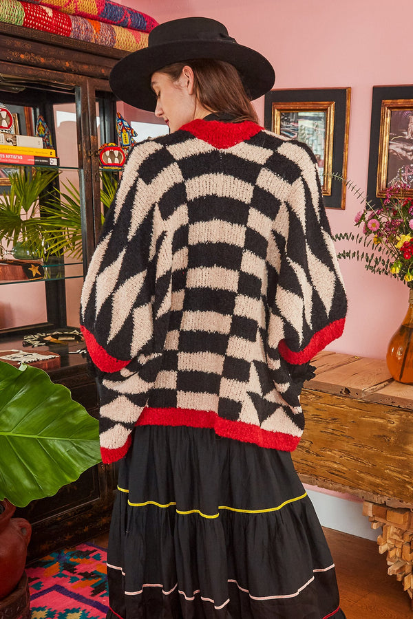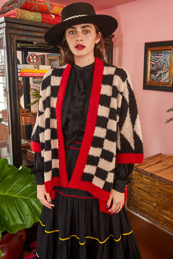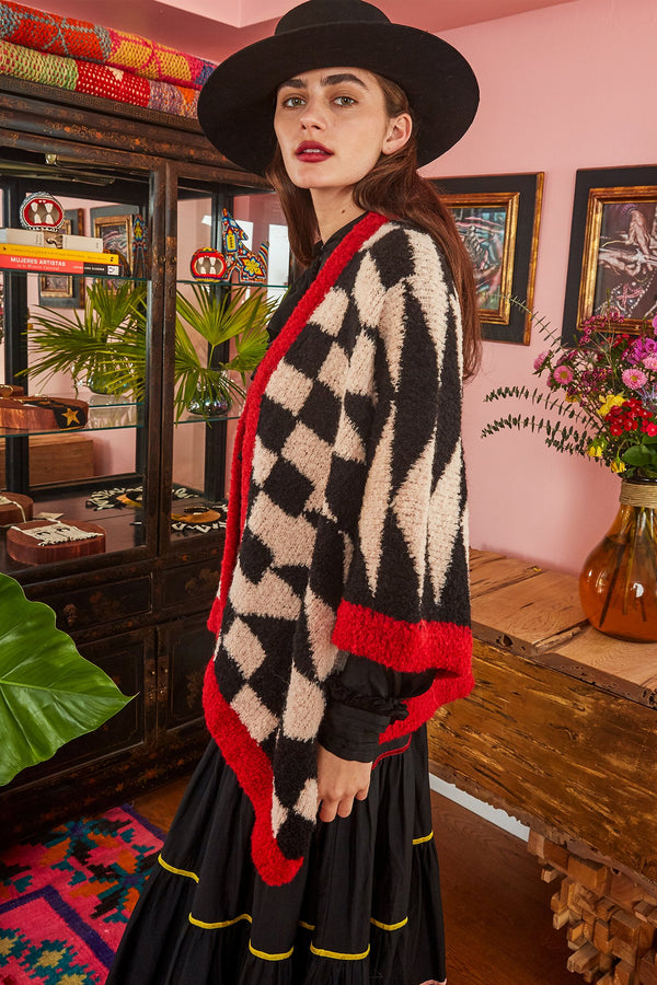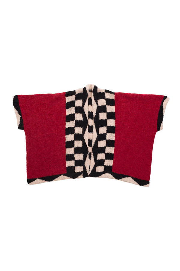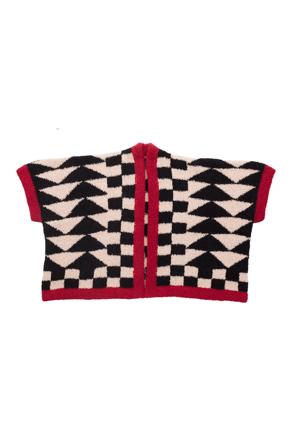 Description Cozy oversized cape featuring a black and white pattern Details Composition: 80% Alpaca 20% Silk Country of origin: Peru Care Dry clean Pictured in Black/White and Red/Black
