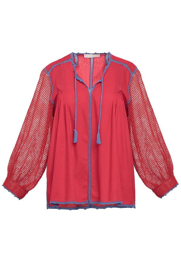 Description Long sleeve, cotton blouse featuring a split neckline, gather detailing at chest, hand-crochet sleeves, and straight hem. Unlined. Handmade by artisans. This piece is sustainably produced without the use of electricity, pesticides or chemicals. Sizing Model is 5'9" |...
