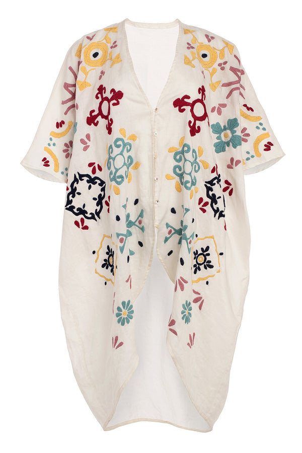 Description Embroidered kaftan featuring front buttons and a flowing silhouette Hand made by artisans in Mexico Details Deep V neckline Buttons along the front Unlined Composition: 100% linen Country of origin: Mexico Sizing Models wear size small Care Dry clean...