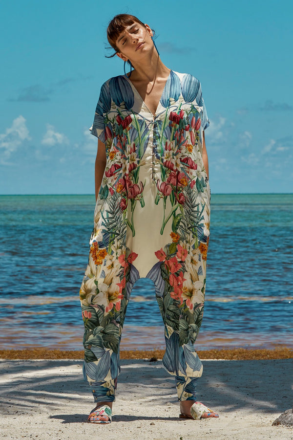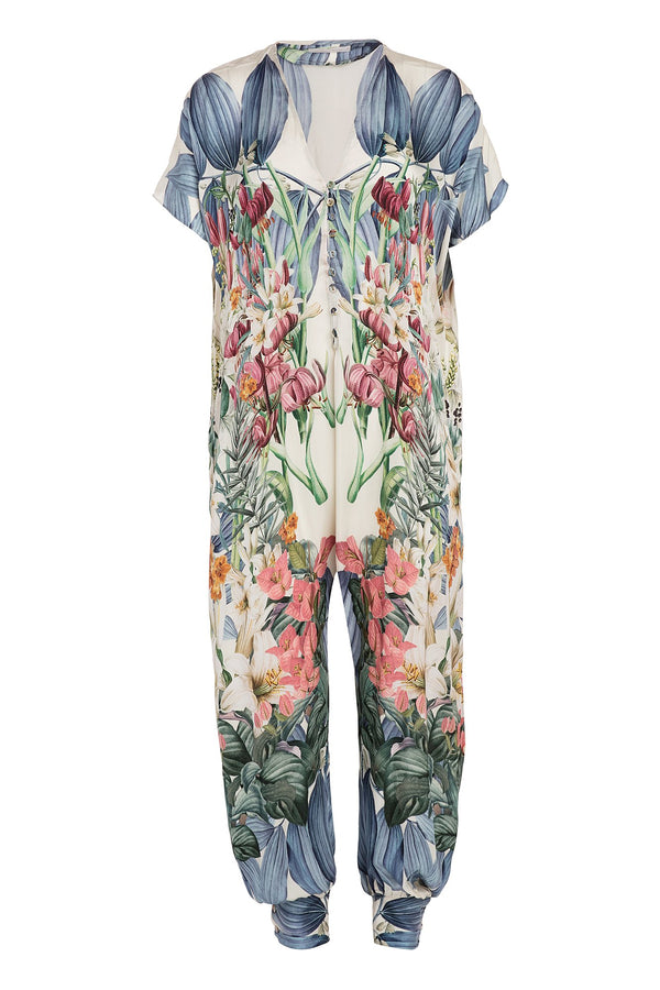 Description Short sleeve jumpsuit featuring a floral print and a flowing silhouette. Details Button fastening through front Unlined Composition: 100% satin viscose Country of origin: India Sizing Model is 5'6" | 30" bust | 23.5" waist | 34" hips Model...