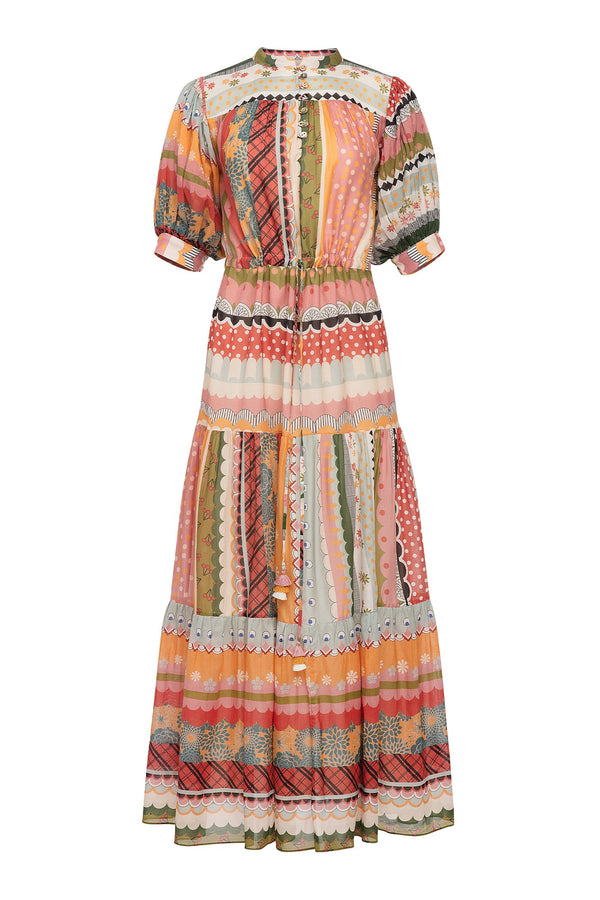 Description Maxi dress featuring a collarless neckline with partial button closure, balloon half sleeves, drawcord waist, and tiered skirt with flowing silhouette. Lined. Sizing Model is 5'9" | 32.5" bust | 23.5" waist | 36" hips Model wears size small...