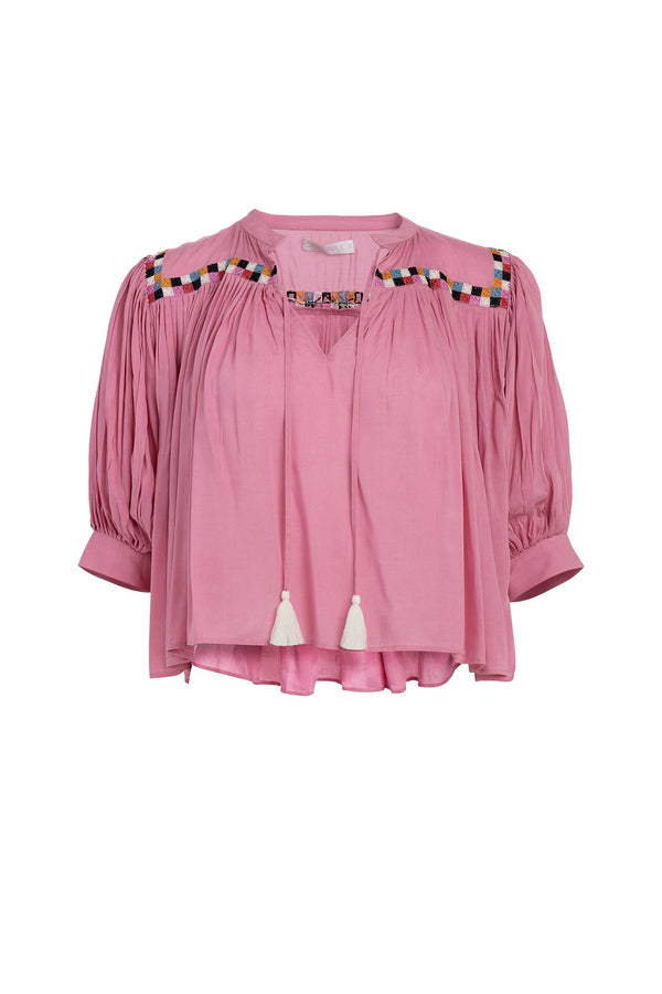 EXPECTED TO SHIP DECEMBER 10th Description Three quarter sleeve top featuring embroidery along the shoulders and front tassels Details Deep V neckline Unlined Composition: 95% cotton 5% viscose Country of origin: India Sizing Model is 5'9" | 32.5" bust |...