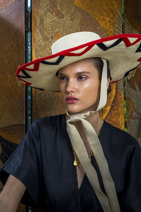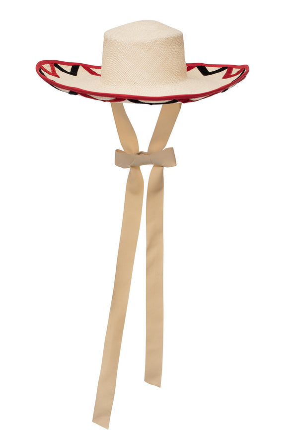 Description Oversized hat featuring triangle decor and neck ties Details Composition: 100% straw Country of origin: Ecuador Care Dry clean Pictured in Natural / Red