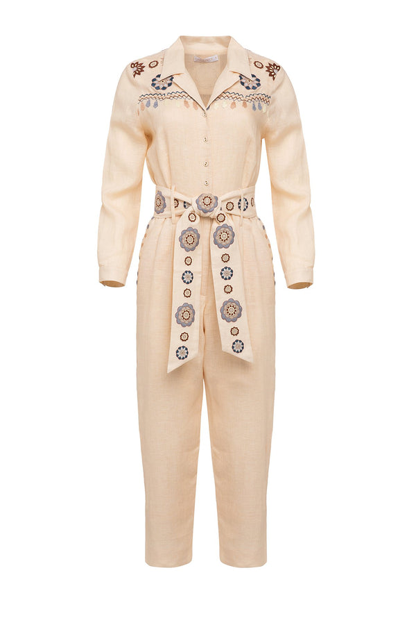 Description Cropped linen jumpsuit featuring a notch lapel, long sleeves, front button closure, and belt loops at waist with removable self-tie belt. Embroidery detail throughout chest, back, self-tie belt, and front slash pockets. Straight leg with rolled cuff. Sizing Model...