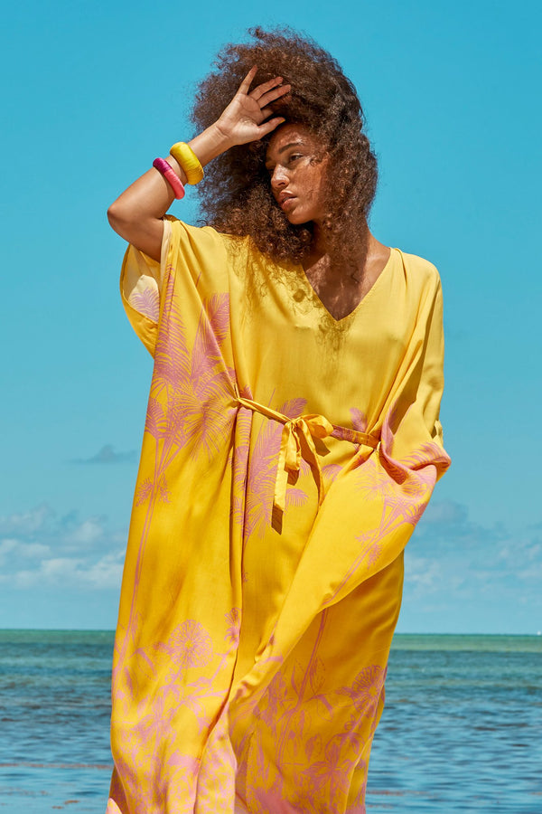 Description Maxi kaftan featuring a flowing silhouette and a hidden self tie belt. Details V-neck Slip on Back keyhole with button Side pockets Unlined Composition: 95% cotton 5% viscose Country of origin: India Sizing Model is 5'9" | 32.5" bust...